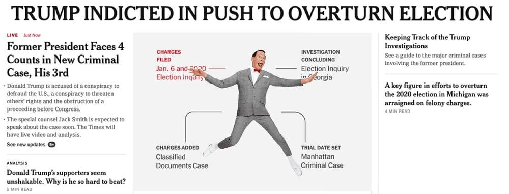 I've had lots of opportunities to talk about Donald Trump, which frankly has given me a serious case of dry mouth (I'm starting to wonder if that's what happened to Ron Desantis). Here, I have several articles, and within those articles, I added additional color illustrations, including Trump's (alleged) fingerprints, a candid picture of him (or is it Pee Wee Herman?), and a shot of him getting a mug shot.