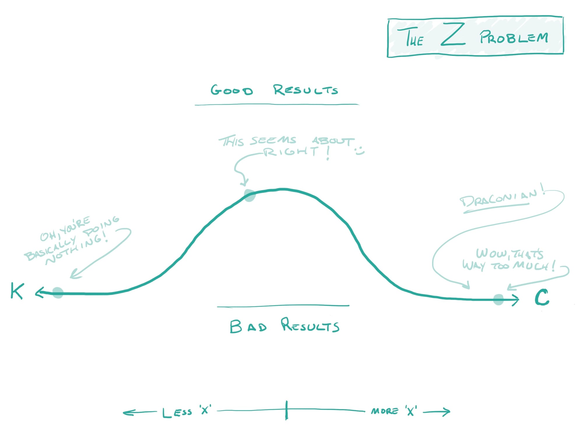 The problem is better evaluated on a bell curve, which you see on the right. This is how public policy can work. Solutions all the way to the left or right are usually bad options. The optimal solution is somewhere in the middle.