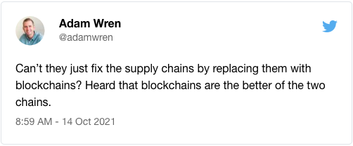 - And the Supply Chain. As an ironic follow-up, President Biden is taking a stab at fixing our supply chain issues by asking the major shipping ports to work more hours. IMPORTANTVILLE’s Adam Wren has a solution as well.